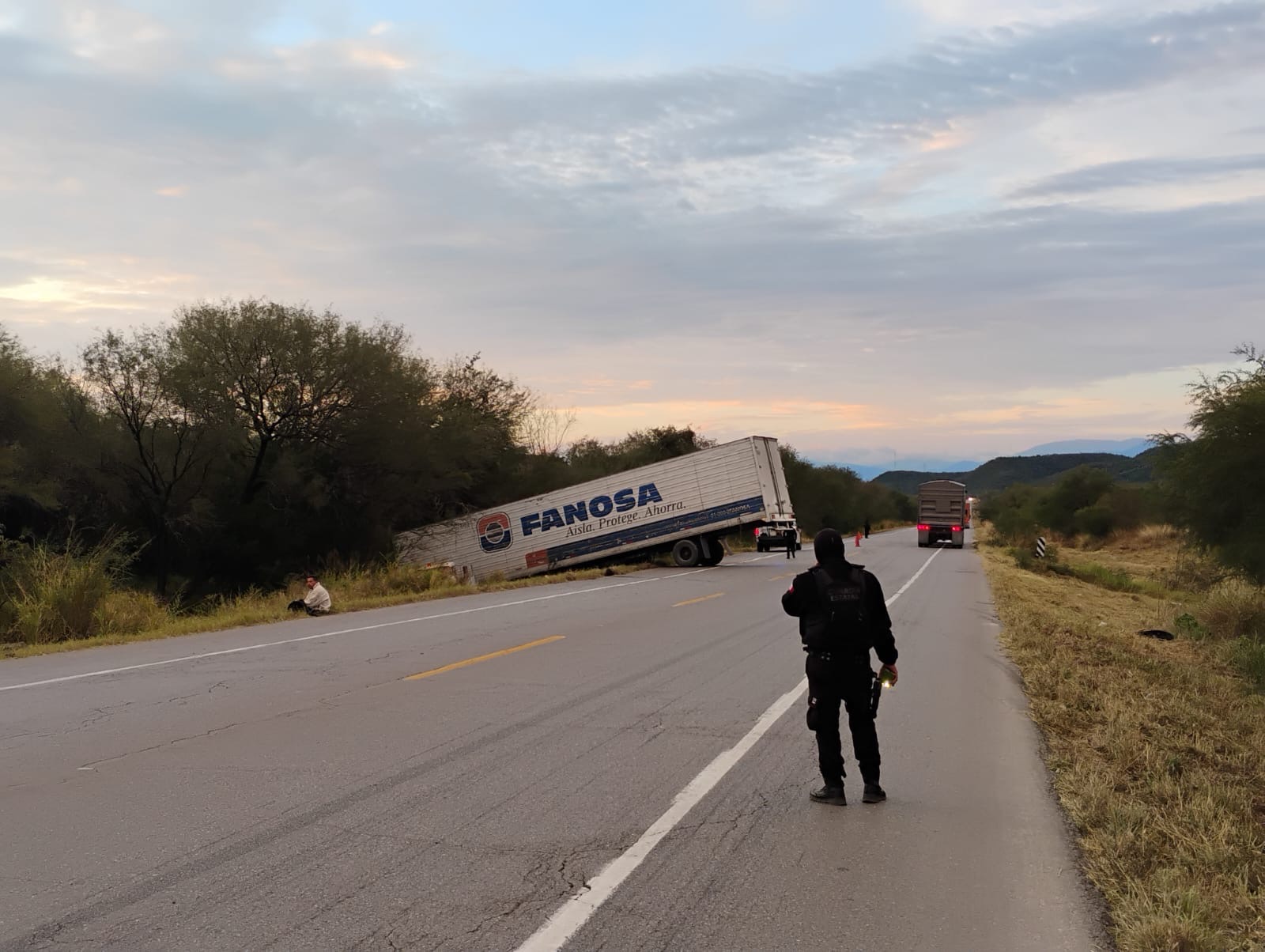 Villagrán, Tamaulipas.- Derivado del derrape de un tractocamión la circulación se encuentra obstruida en el carril de sur a norte de la Carretera Federal 85 Victoria-Monterrey.